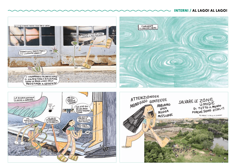 Scopriamo così il lavoro di Alessia, a partire dalla sua ultima opera. Al Lago! Al Lago! (Hopi edizioni, 2024) è un fumetto che racconta l’incredibile storia di una zona umida letteralmente “apparsa” in mezzo a una città.