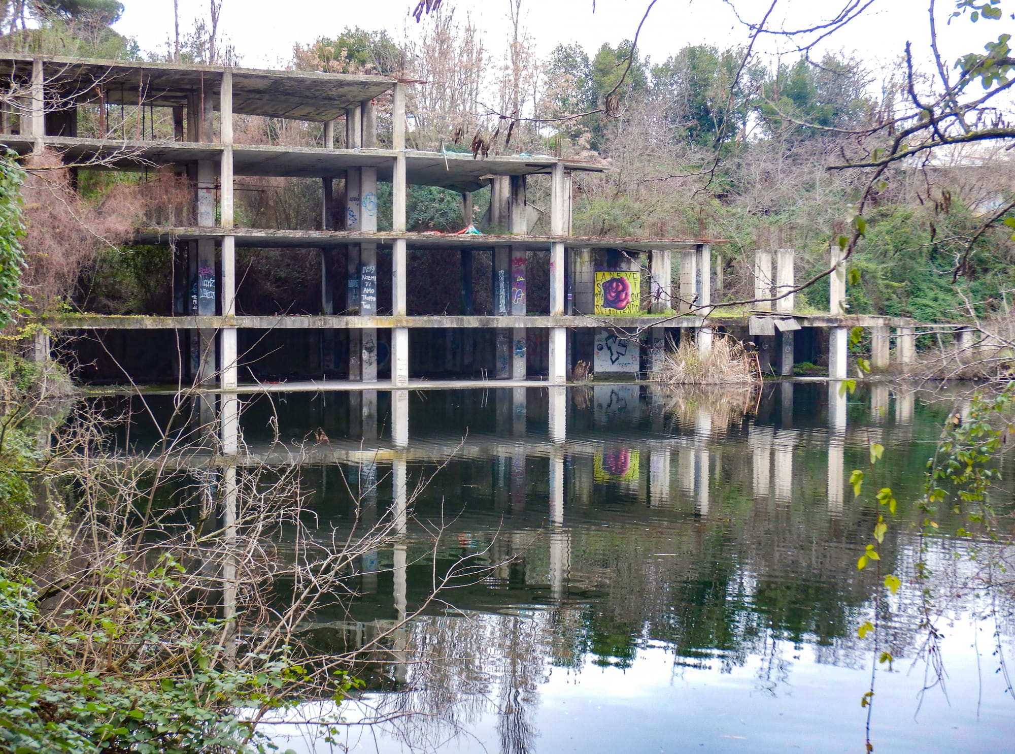 Siamo nel quartiere Prenestino, a Roma est. Qui, nel 1992, iniziano gli imponenti lavori per un centro commerciale di dieci piani. Ma durante gli scavi per la costruzione dei parcheggi sotterranei qualcosa va storto. Viene accidentalmente intercettata la falda acquifera del fosso della Marranella, un affluente del fiume Aniene. L’intero quartiere si allaga. E si forma uno specchio d’acqua che si estende per tutta la struttura di cemento armato del centro commerciale, che rimane per sempre incompiuto. Nasce così il lago Bullicante.